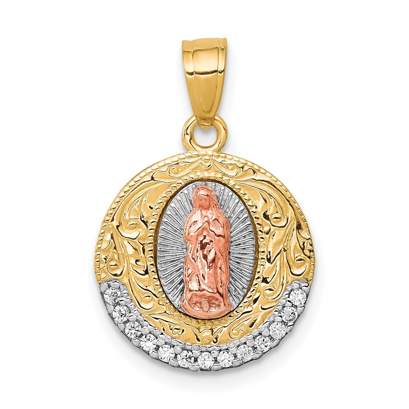 Introducing the stunning 10K Two-Tone Lady Of Guadalupe Round Pendant, a perfect blend of elegance and faith. This beautiful piece features a polished finish and adds a touch of charm with its cubic zirconia stone. Measuring 20.9 mm in length, the pendant