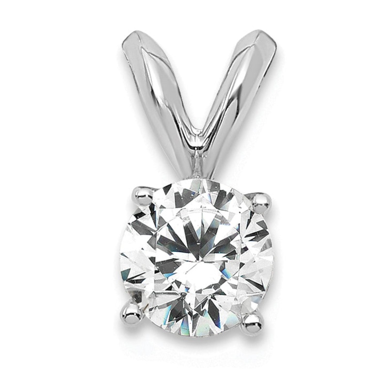 Introducing the stunning 14k White Gold 1/3 Carat Certified Lab Grown Diamond VS+ F+ Round Complete Four Prong Solitaire Pendant. This elegant piece shines with a 0.37 ct round diamond set in a polished 14K white gold pendant. The diamond’s clarity and color enhance its beauty, making it perfect for any occasion. Measuring 10mm in length and 5.1mm in width, this pendant displays a modern design that pairs well with any outfit. The rhodium plating adds extra shine and durability. Adorn yourself or a loved one with this exquisite 14k White Gold Pendant for a timeless touch.