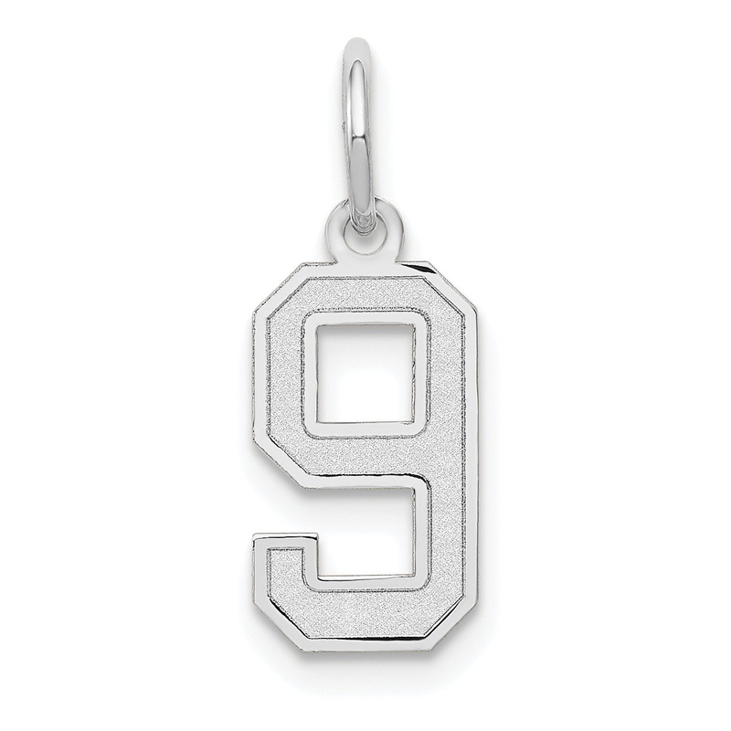Introducing our 14k White Gold 14kw Small Satin Number 9 Charm, a must-have for jewelry lovers. Crafted from pure 14K gold, this delicate piece exudes a brushed finish for a chic look. With dimensions of 14.32mm in length and 7.11mm in width, this charm is perfect for a subtle statement. Its rhodium plating emphasizes the intricate laser-cutting process it has undergone. This satin textured charm is sold individually as a pendant, perfect for those themed outfits. Grab this small piece of white gold beauty, marked with the lucky number 9, to elevate your charm collection!
