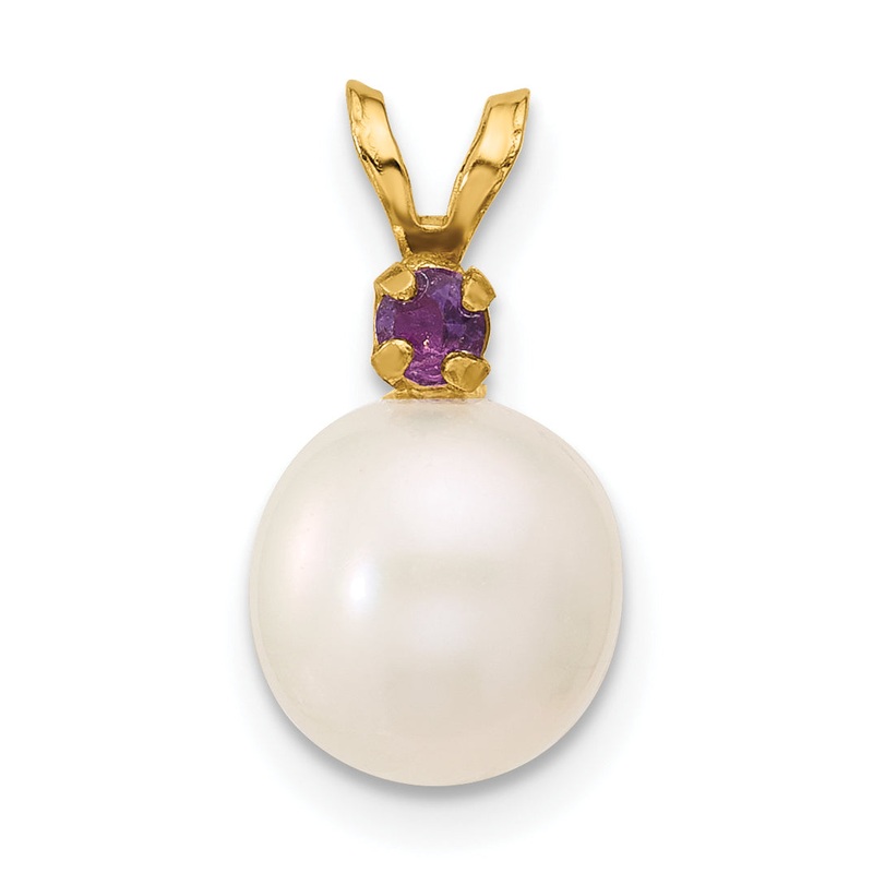 Check out our stunning 14k Yellow Gold Freshwater Cultured Pearl Pendant. This pendant features an 8-8.5mm white round pearl daintily nestled with a purple amethyst, bringing a combination of timeless elegance and modern style. The charm of the 14k yellow gold gives the pendant an added splash of luxury. Your priceless stone is natural amethyst and the pearl is conflict-free, beautifully crafted to deliver an exceptional finish. This pendant is the perfect gift for the February-born lady in your life. Our 14k Yellow Gold Freshwater Cultured Pearl Pendant is a combination of elegance and style, offering the ideal accessory you need.