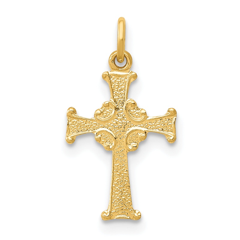 Introducing the stunning 14k Yellow Gold Celtic Cross Charm, an ode to exquisite craftsmanship and timeless design. This piece, with a size of 18mm, has been die-struck to perfection ensuring an explicit detailing that mesmerizes every onlooker. Emblazoned with a unique textured finish, its width measures 10mm. This solid charm pairs perfectly with pendants to add depth and character to your collection. Made of high purity 14K gold, its vibrant yellow color imbues a warm, luxurious feel. Let each 15mm length of this Celtic cross charm, with a bail length of 3mm, be the star that outshines all that surrounds it. Dress up your style with this 14k Yellow Gold Celtic Cross Charm.