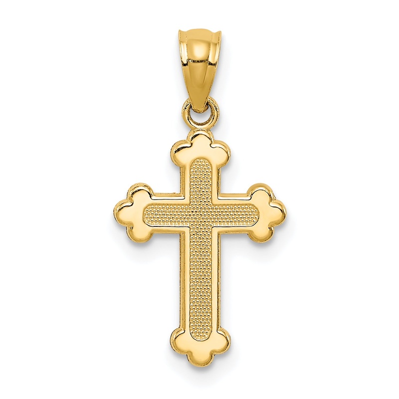 Experience the divine allure of our 14k Yellow Gold Polished Small Budded Cross. This charming piece measures an unimposing 22.5mm in length, with a modest width of 11.5 mm, perfect for those who cherish subtle elegance. Each unit of this treasured jewelry