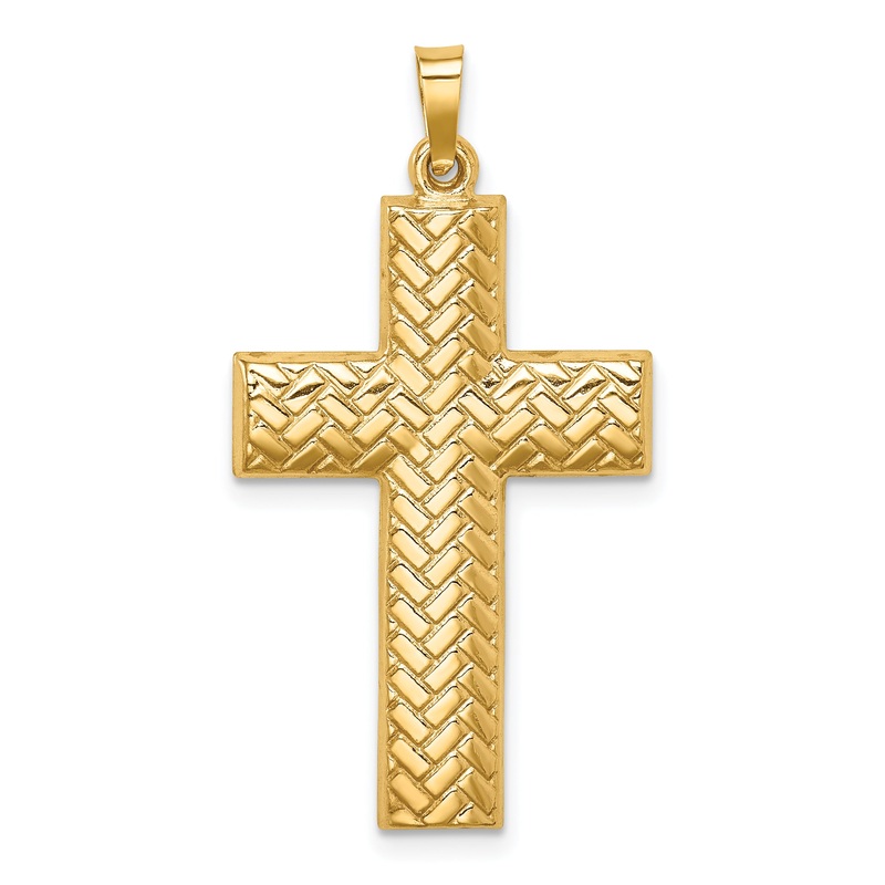 The 14k Yellow Gold Hollow Polished Basketweave Design Latin Cross pendant is a stunning piece that combines faith with elegance. This intricate charm features a unique woven texture that catches the light beautifully. Measuring 35 mm in length and 19 mm i