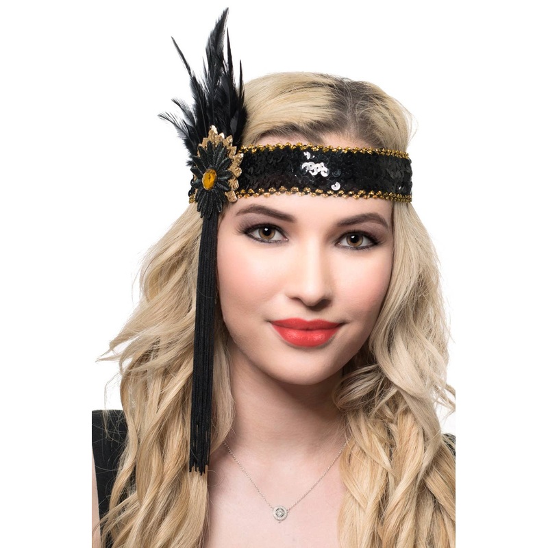 Black and Gold Sequined Flapper HeadbandMake sure you look the part at your upcoming 1920s dress up party wearing this black and gold feather headband. This 1920s costume headband with gorgeous feathers and sequins is the perfect roaring 20s fancy dress ac