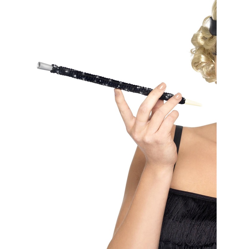 Black Sequin 1920s Cigarette HolderIncludes:Cigarette holderDescription:Novelty black plastic cigarette holder with white and silver ends.Cigarette holder is covered in shiny black sequins.Tips:Pair this black sequin cigarette holder with a headband and a