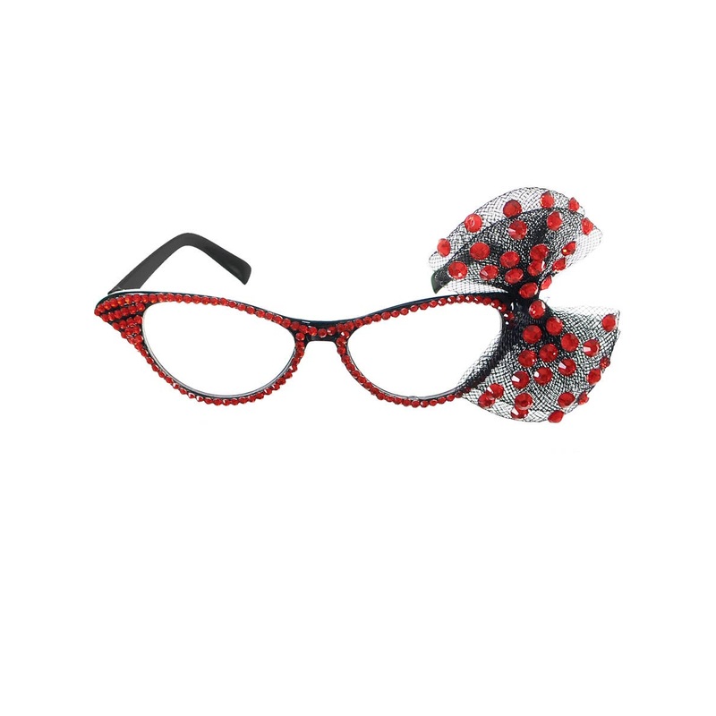 Red Rhinestone Womens Costume GlassesTransform in to a stand out pin-up girl when you pop on these rhinestone 1950's red costume glasses. 50s Glasses with bow will keep you looking as though you have just stepped out of a nifty time machine. Get ready to d
