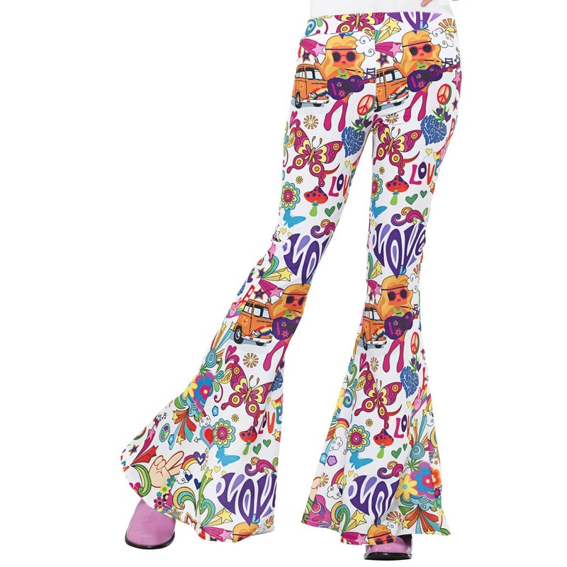 Womens Groovy Flared 1960's Costume PantsIncludes:PantsPlease note: shoes are not included.Womens pants are made from non stretch polyester fabric with a button and zip closure.Pants are flared at the bottom and should be worn high on the waist.Pants have