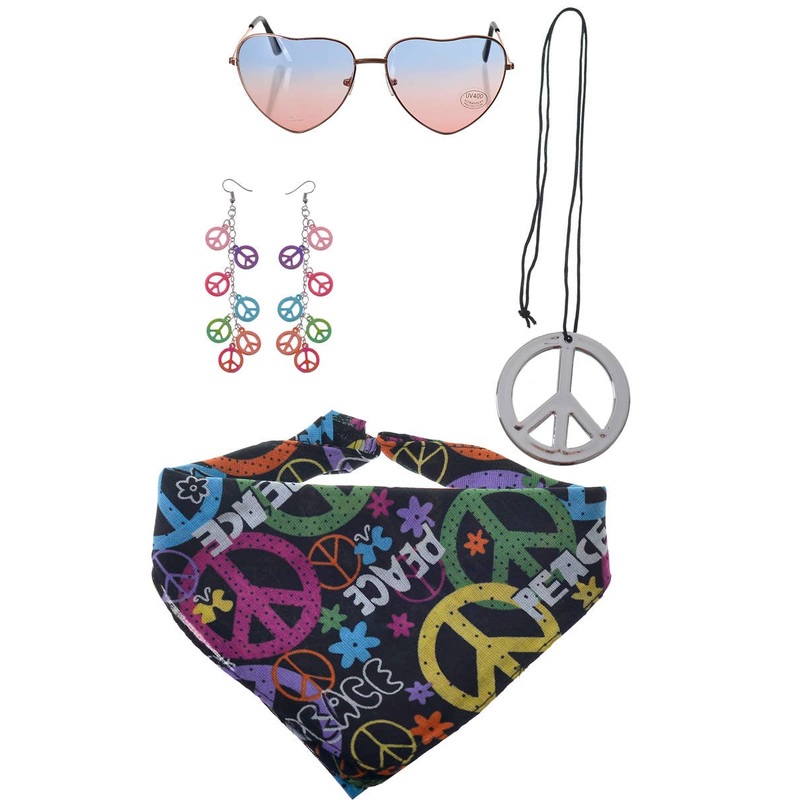 70's Peace and Love Costume Accessory KitIncludes:SunglassesEarringsNecklaceBandannaDescription:Non-stretch costume bandana features multicoloured peace sign print with butterflies and flowers.Bandana measures approximately 50x50cm wide.Glasses have a rose
