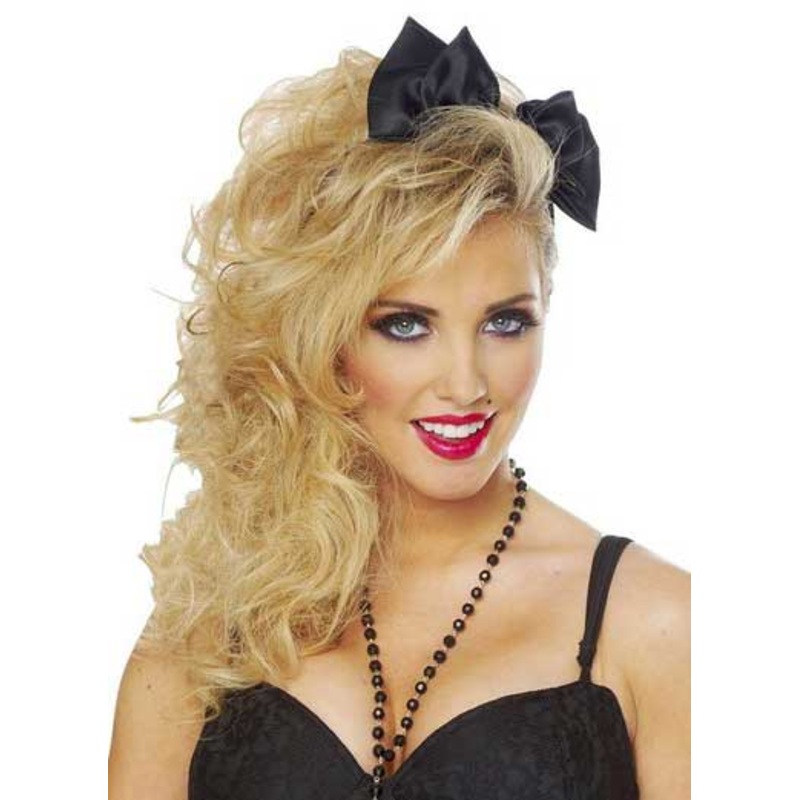 Black Satin Bow 80's HeadbandGo 80's to the max wearing this cute black satin bow headband! This funky black costume headband with attached bow is the ideal 80's or Madonna pop star accessory to complete your cute 1980's costume!Description:Black plastic h