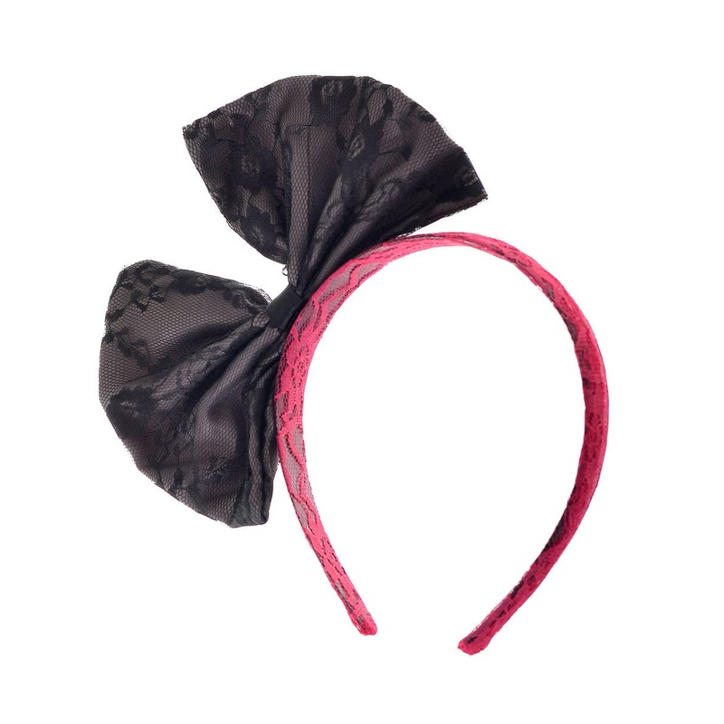 80's Costume Headband with Pink Lace and BowParty like it's 1988! Dress up in this fabulous pink and black lace bow headband for a totally tubular night of fun! Perfect for an 80s themed dress up party, this costume headband is sure to get you noticed. So