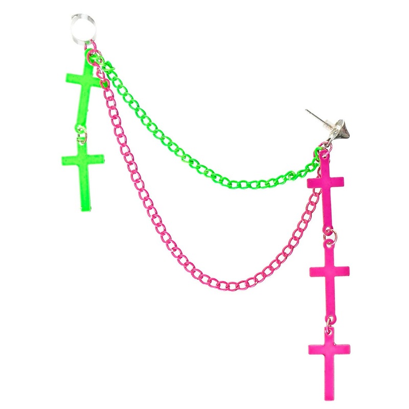 80s Green and Pink Crosses Earring CuffGo for an edgy look for your next 1980s themed dress up party with some punky costume accessories like this earring cuff. No 80s look is complete without some costume jewellery, so grab yourself this pink and green ch