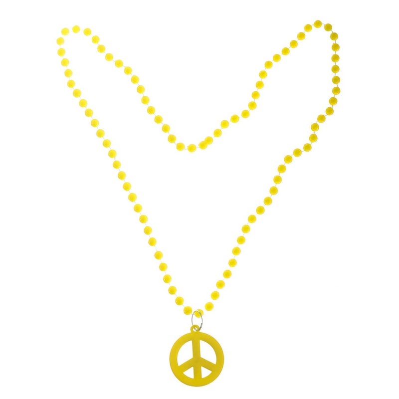 Beaded Yellow Peace Sign Costume NecklaceIncludes:NecklaceDescription:Yellow plastic beads are attached to a white string.Attached to the beads with a silver split ring is a yellow plastic peace sign pendant.Necklace measures approximately 84cm.Peace sign