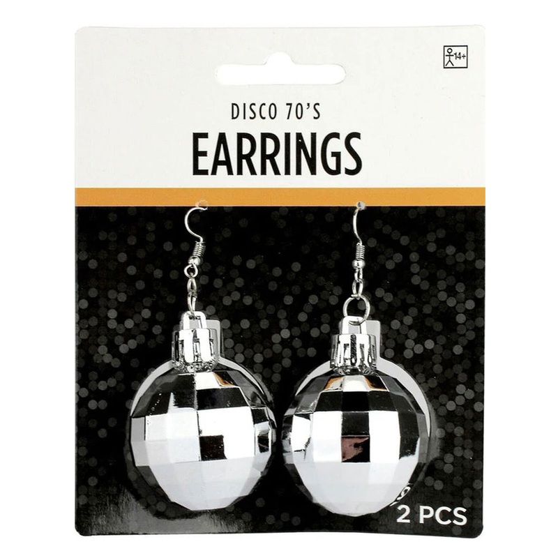 Silver 1970s Disco Ball Costume EarringsIncludes:EarringsDescription:Disco ball earrings are made from silver plastic.Earrings are for pierced ears and have a fish hook backing.Disco earrings styling tips:Make your 70s costume stand out with this disco bal