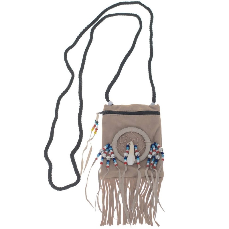 Authentic Cream Suede Native Indian Medicine BagSuede pouch decorated with a beaded dream catcher and tooth, this deluxe quality American Indian medicine bag will tick all the boxes for your next Cowboys and Indians party. Use this cream suede pouch to acc