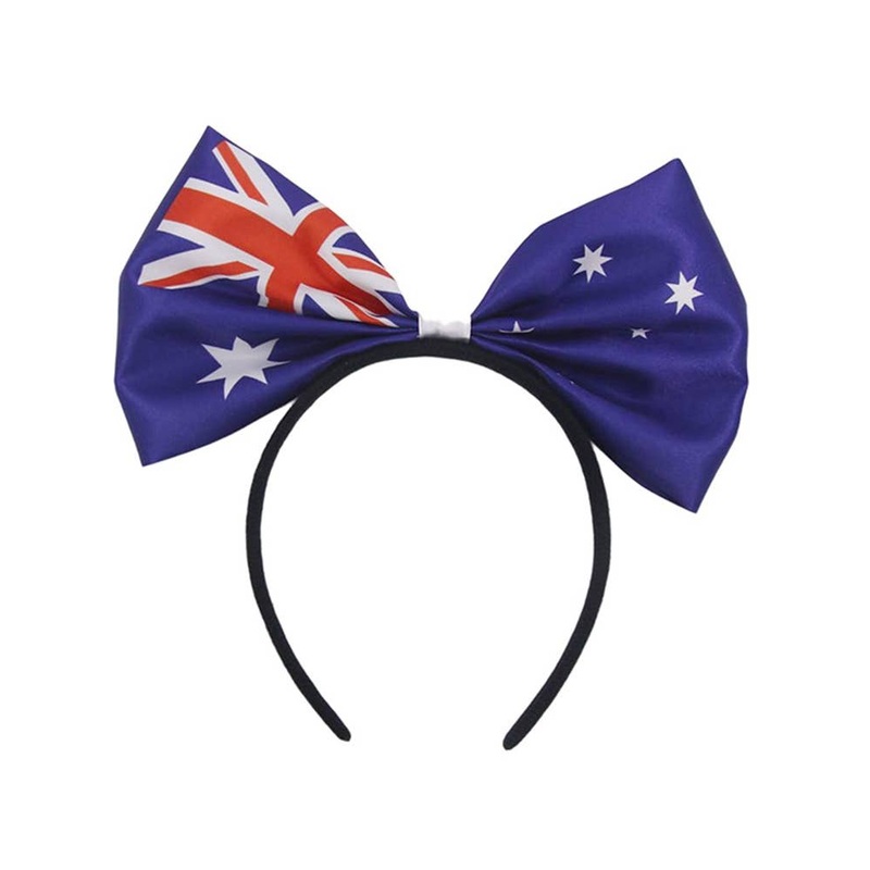 Oversized Australian Flag HeadbandIncludes:HeadbandDescription:Bow is made from a satin polyester material.Printed on the bow is the Australian flag on the front and back.Headband is made from a lightweight plastic covered in a black felt fabric.Oversized