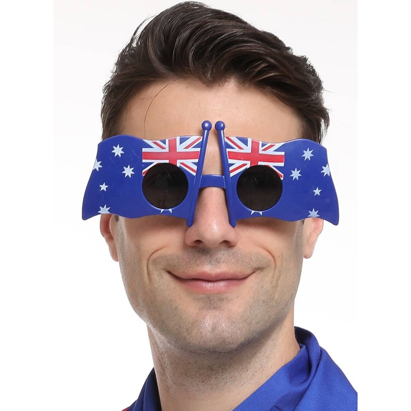 Funny Blue Australia Day Flag GlassesIncludes:GlassesDescription: Sunglasses have round black lenses and a blue frame.Frame is in the shape of the Australia flag.Styling tips for your aussie flag glasses:Stand out this Australia Day when you pair these gla