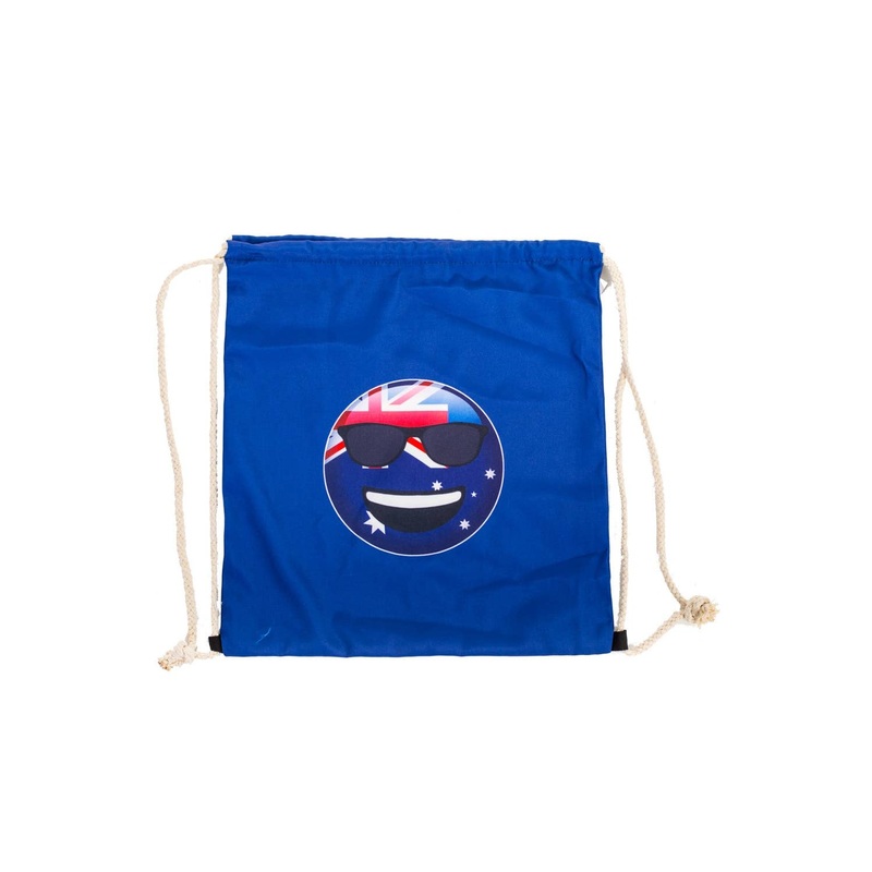 Novelty Aussie Flag Emoticon Bag AccessoryIncludes:BagDescription:Bag is made from blue canvas fabric and has rope drawstrings on either side and can be worn as a backpack.Backpack has the Australian Flag inside of the cool dude with sunglasses emoji face