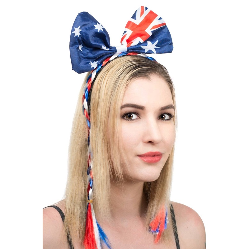 Australian Flag Bow with Braids HeadbandIncludes:HeadbandDescription:Large Australian Flag print bow attached to a headband.The bow is made from a satin polyester fabric.Bow is fastened to headband with a white ribbon in the centre.Attached to the headband