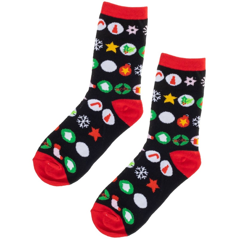 Black Christmas Bauble Printed Christmas Socks with Red TopsIt is not just the tree that can be decorated with baubles, these costume socks are a cute Christmas accessory to cover your feet with ornament print. For a festive touch, the socks also have snow