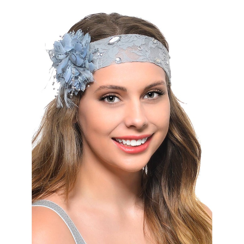 Golden 20s Grey Lace Headband Description:Put on the ritz at your upcoming great Gatsby theme dress up party when you dance the night away wearing this grey lace headband with flower.Costume Headband Details:The headband is made from soft stretch grey lace