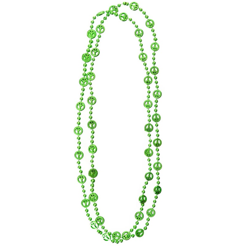 Green Peace Sign Hippie Costume NecklaceIncludes:NecklaceDescription:Pack of 2 plastic beaded necklaces.Necklaces are a metallic green colour.Between the beads are small peace signs.Each necklace measures approximately 37cm long.60s Costume Styling Tips:Pa