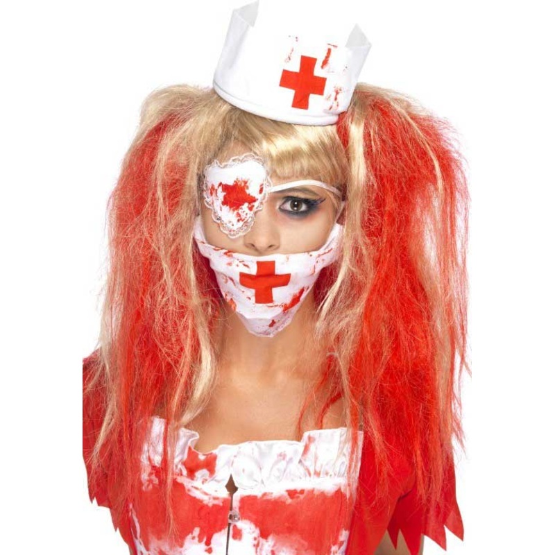 Bloody Nurse Fancy Dress SetThis nurse hasn't taken very good care of her patients! This cheap and easy awesome costume kitis the perfect thing to bloody yourself up this Halloween.Description:White mouth mask with blood splatters and white elastic to secu