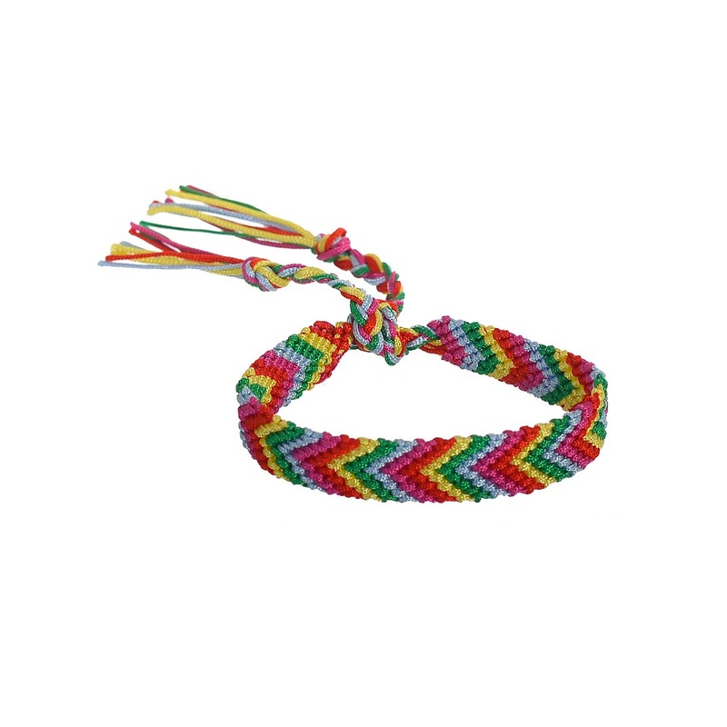 Rainbow Boho Jacquard Wrist Tie Costume AccessoryIncludes:BraceletDescription:Jacquard wrist tie is in green, yellow, red, pink and blue.All the colours are in an arrow pattern.The back of the wristband is braided in all the colours that tie up to keep sec