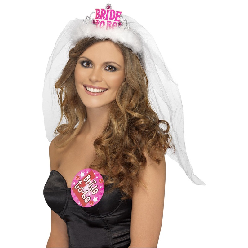 Pink and White Bride To Be Tiara and VeilIncludes:TiaraPlease note: badge is not included.Description:Tiara is made from silver plastic and features pink faux jewels.On the front is "Bride To Be" in pink font with a white feather trim along the front.Attac