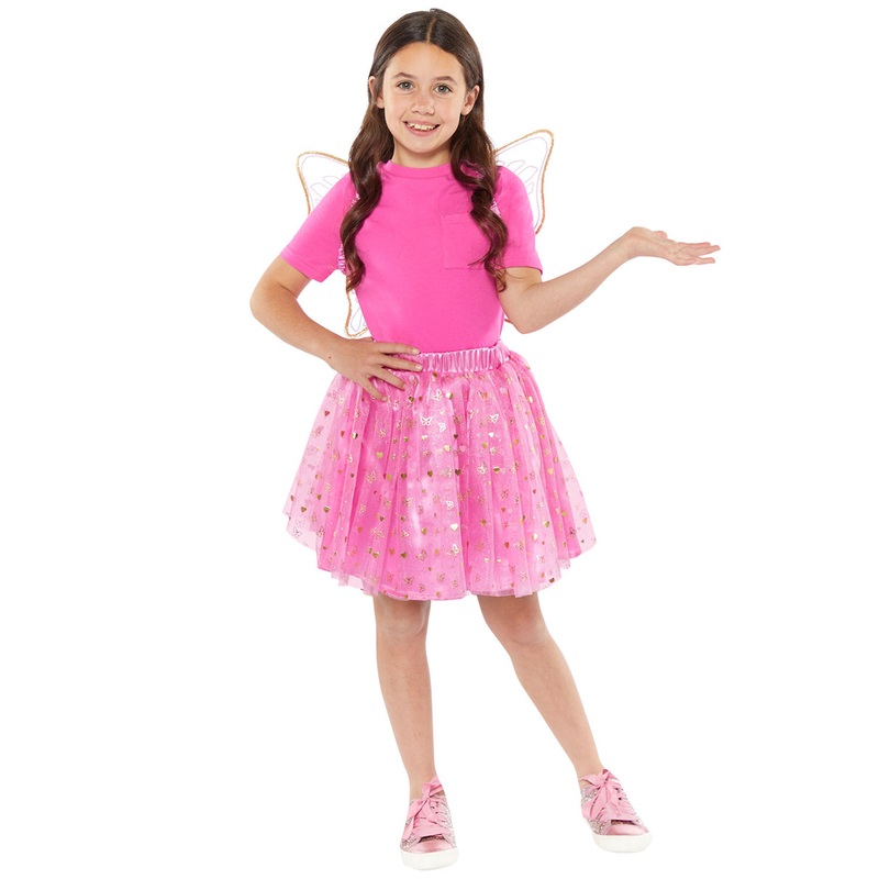 Girls Pink Butterfly Wings and Tutu SetIncludes:WingsTutuDescription:Pink tutu with elastic waistbandTutu has a sheer overlay with gold butterfly print detailsWings are sheer with gold trim detailsPink elastic straps secure the wings over the shouldersStyl