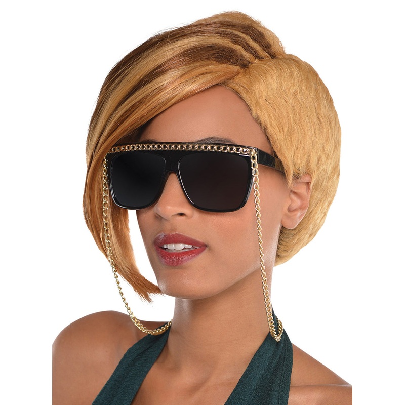 Adults Black Chained 90s Costume GlassesIncludes:GlassesDescription:Glasses have a black plastic frame and black tinted lenses.Attached above the lenses is a gold chain that hangs down and sits around the neck.One size fits most.90s glasses styling tips:We