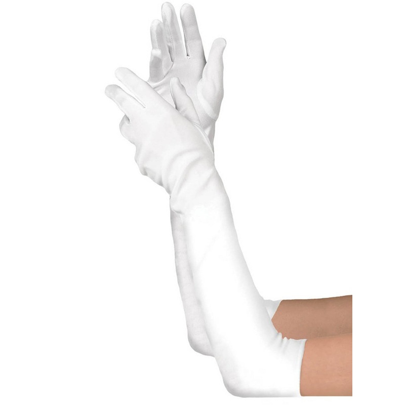 Womens Long White Costume GlovesIncludes:GlovesDescription:White stretch material gloves.Gloves are elbow length.One size fits most.White gloves styling tips:Add these long white costume gloves to your Cinderella costume or flapper outfit!