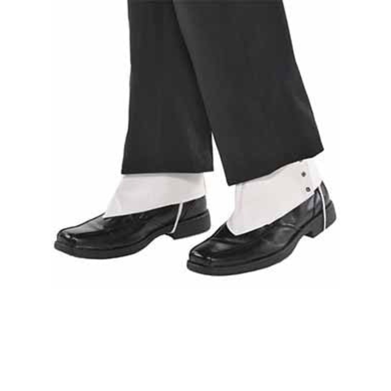 Mens 1920s White Shoe SpatsIncludes:SpatsDescription:White shoe spats decorated with black buttons.Spats have a white band that sits under the shoe.One size fits most.Spats styling tips:These white spats are a great way to step up your gangster costume!