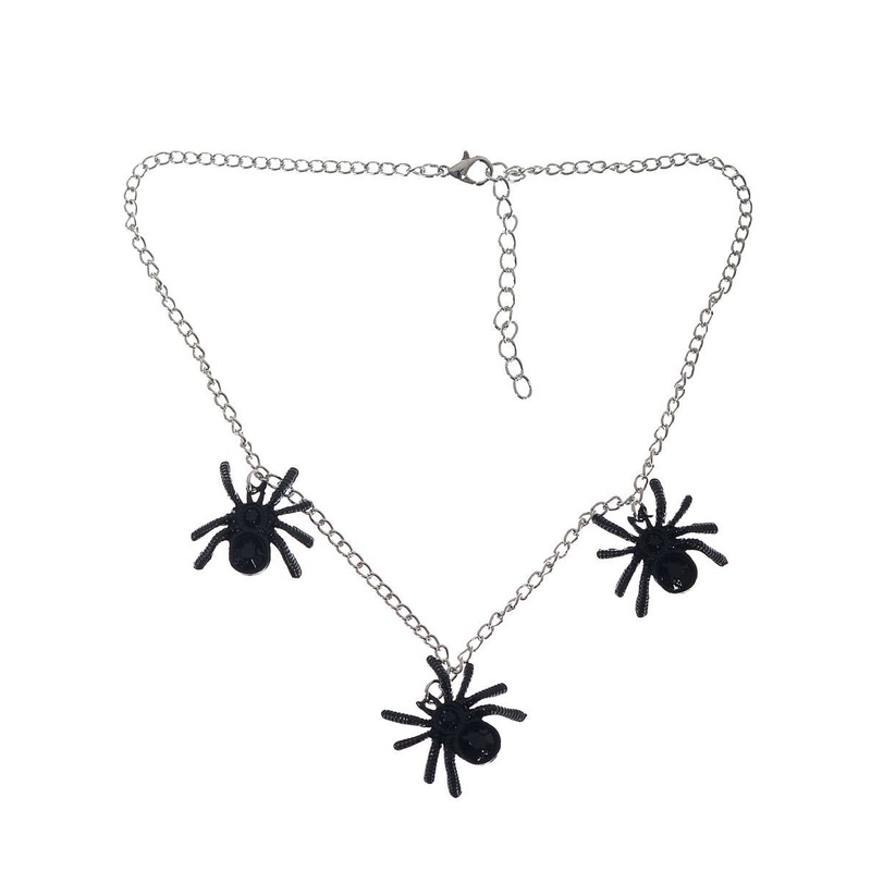 Spooky Spiders with Rhinestones Halloween NecklaceSpiders, but make them sparkle! This creepy costume necklace does include spider pendants but they aren't scary spiders, they're are disco spiders! Adorned with black jewels, this Halloween accessory will t