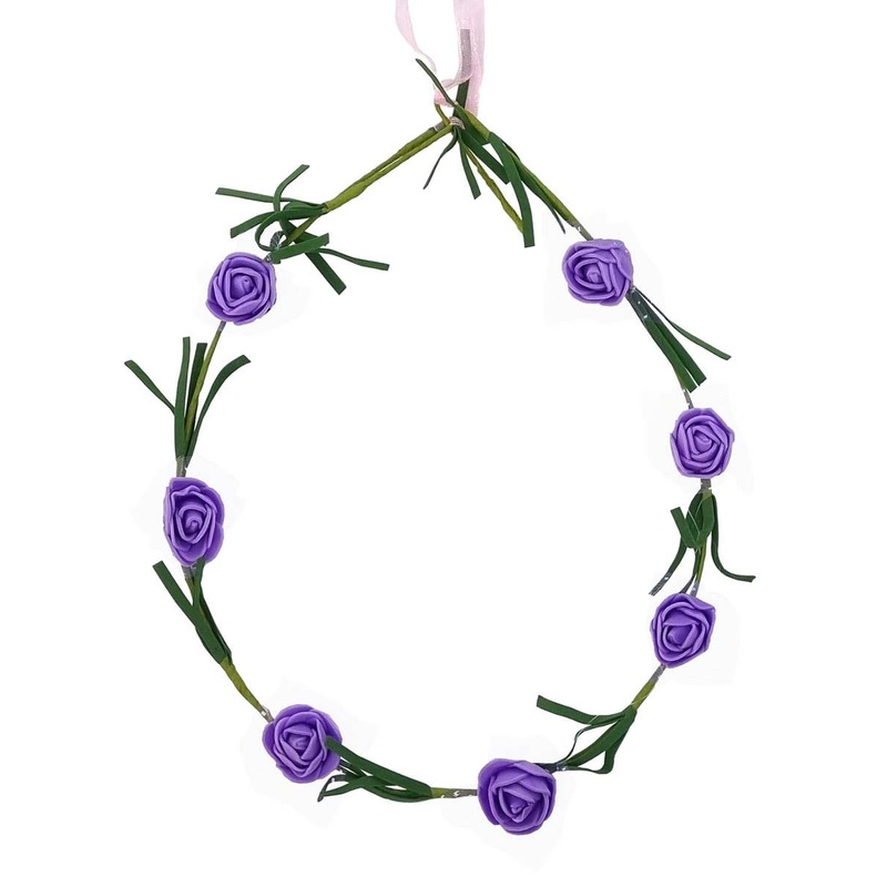 Purple Flower Crown HeadpieceThis beautiful purple flower crown is the perfect accessory for any fairy-themed fancy dress party! The flowers are made from a soft fabric, and the leaves are a deep green color. The crown is also adorned with purple polka dot