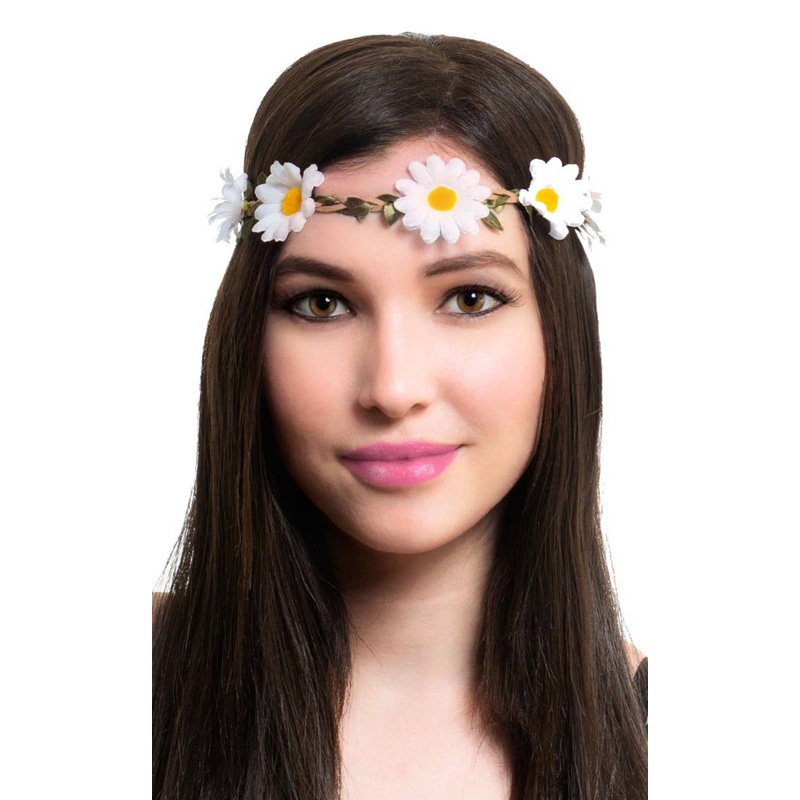White 1960s Daisy Flower Crown HeadbandIncludes:HeadbandDescription:Daisy flower crown sits on a brown braided faux leather strap.The strap features green fabric leaves throughout.Five white fabric daisy flowers sit along the band.Headband features elastic