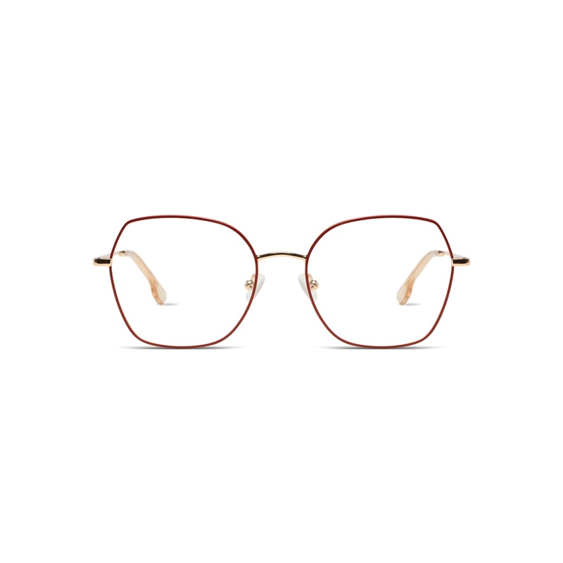 Always has two colored fronts and two acetate fronts. Two classical colors and two contrasting colors.Always combined with a metal color. Based on a hexagon shape which goes cat-eye, very soft angles on the inside and strong angles on the outside of the fr