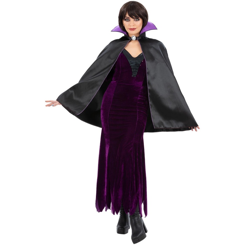 Womens Evil Queen Black Costume CapeIncludes:CapePlease note: dress and shoes are not included.Description:Cape is black with a purple lining.Costume cape has a stand up collar.On the front of the neck is a silver pendant.One size fits most.Tips:Finish off