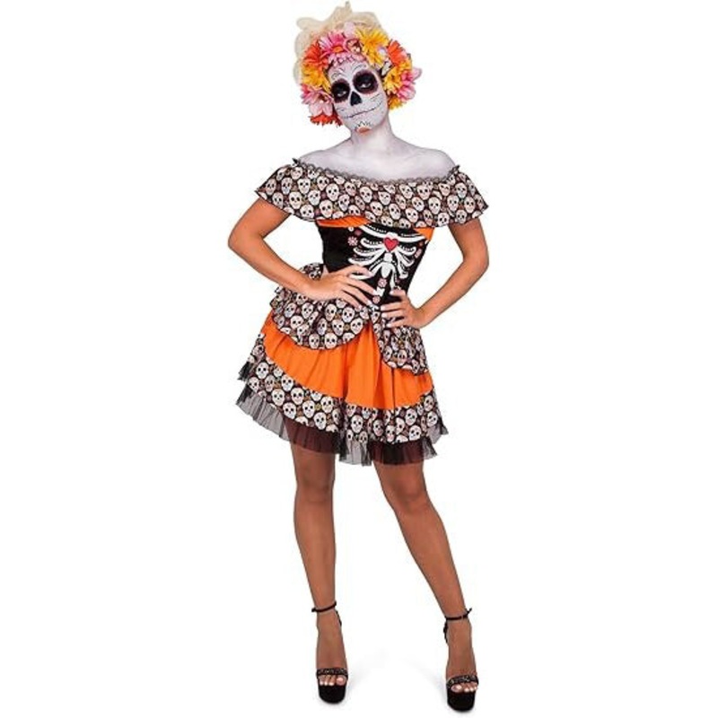 Womens Plus Size Black and Orange Day of the Dead CostumeIncludes:DressPlease note: headpiece, makeup and shoes are not included.Description:Off the shoulder dress has a sugar skull printed neckline with orange material underneath.Bodice is black and featu