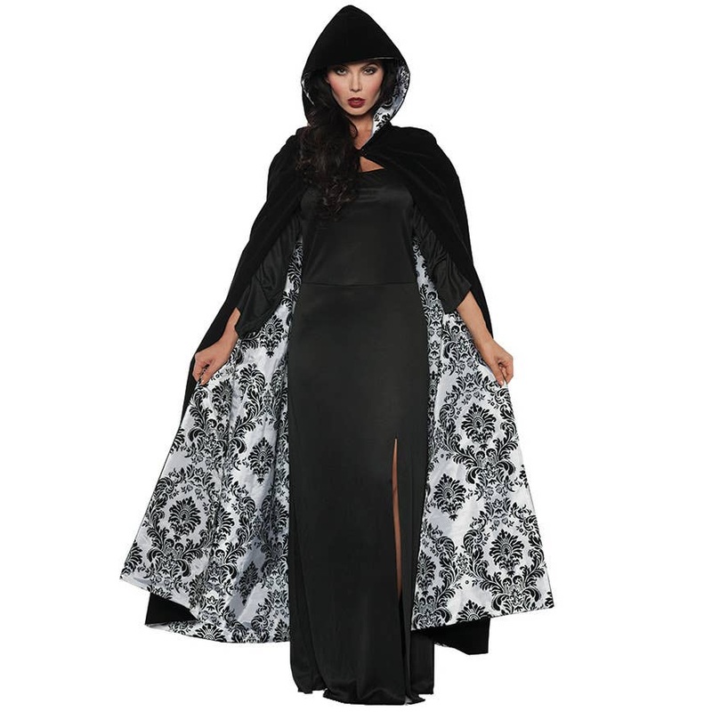Black and White Satin Flocked Costume CapeIf you want stand out from the crowd for your next dress up party then add this black and white deluxe quality costume cape to your look! This high quality black velvet cape with white satin flocked lining is the p