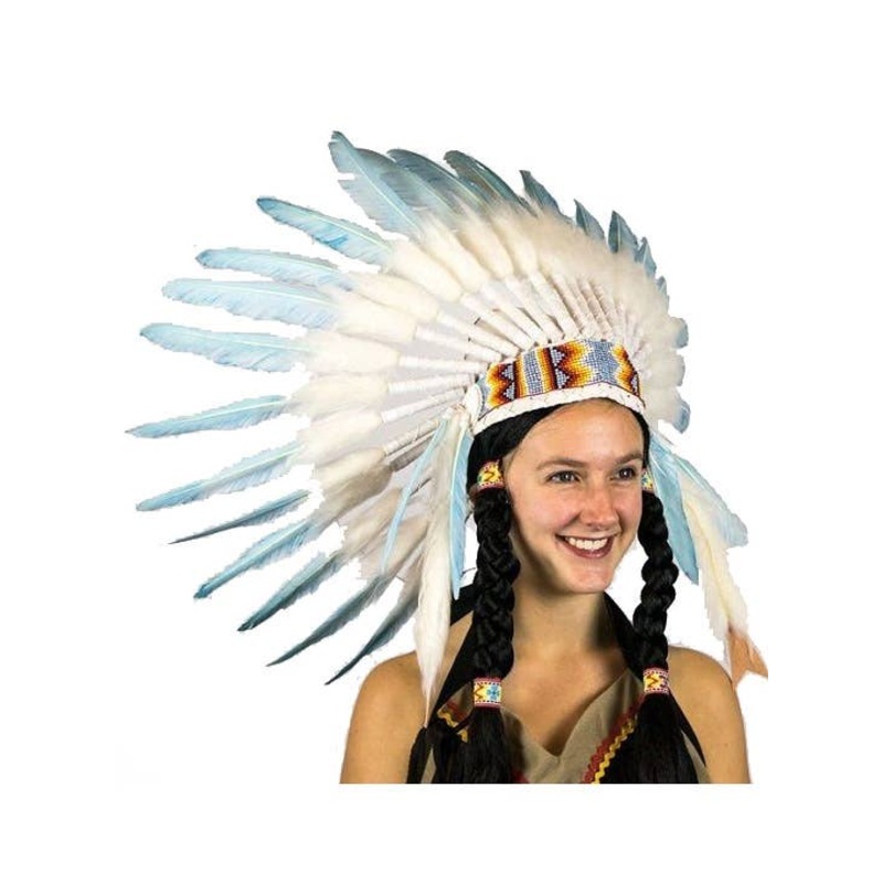 Turquise and White Native American Feather HeaddressThis costume accessory is a beautiful and majestic. Crafted from soft feathers and beaded in intricate patterns, this costume headdress is just what you need to complete your Native American costume.Descr