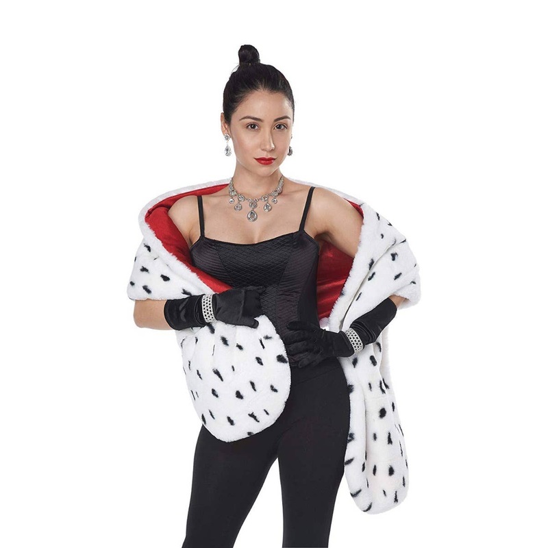 Cruella Inspired Dalmatian Print ShrugTransform yourself into the iconic Disney villain, Cruella De Vil, with this black and white dalmatian print faux fur shrug! Perfect for a movie themed fancy dress event, pair this costume accessory shrug with red glov