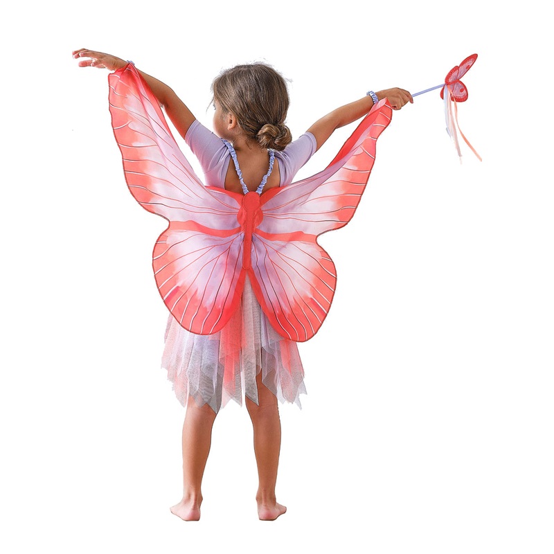 Girls Deluxe Red Butterfly WingsIncludes:WingsDescription:Wings are made from material and are red around the outside and purple and pink towards the centre.Elasticated strap are light purple and sit on the shoulders.Suitable for ages 3-7.Butterfly wings s