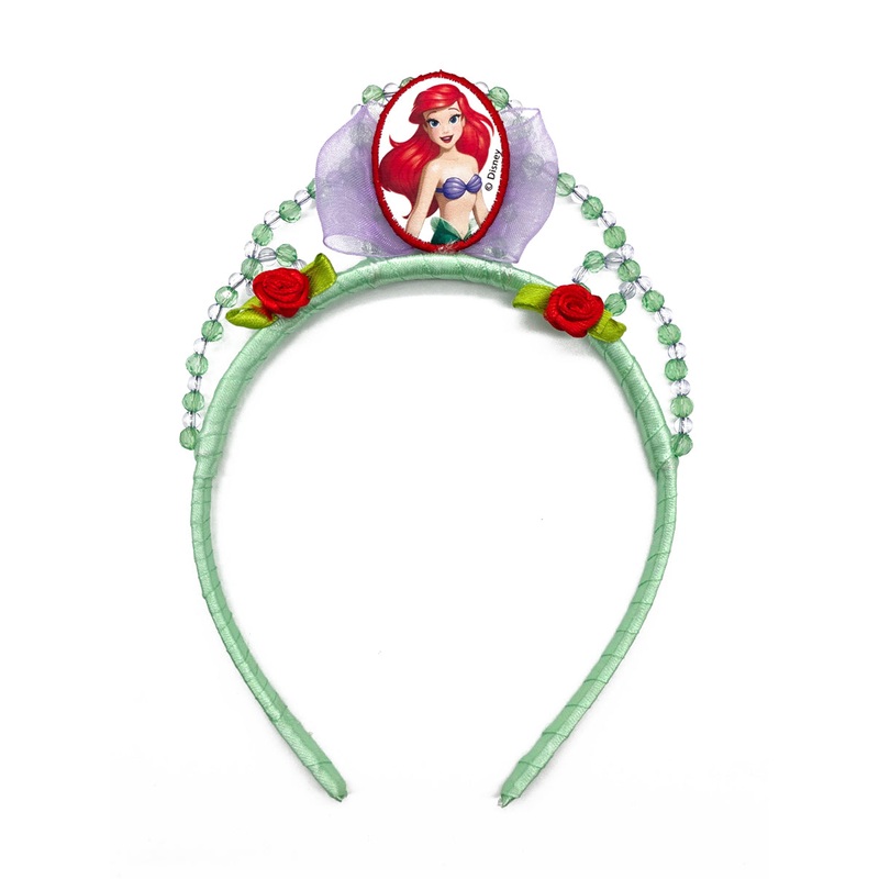 Girls Disney Little Mermaid Costume TiaraIncludes:HeadbandDescription:Green satin-wrapped Ariel tiara.Purple organza bow at the centre.Beaded tiara frame in green and clear beads.Red satin rose details on each side.Portrait of Princess Ariel in the centre.