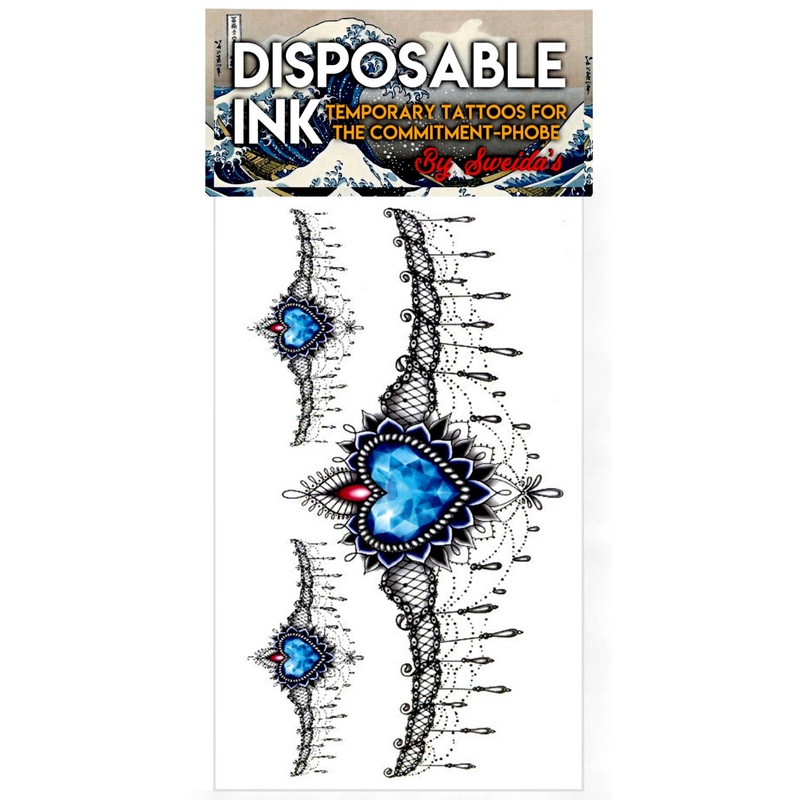 • Temporary tattoos features a blue sapphire heart at the centre with black lace and beaded details.