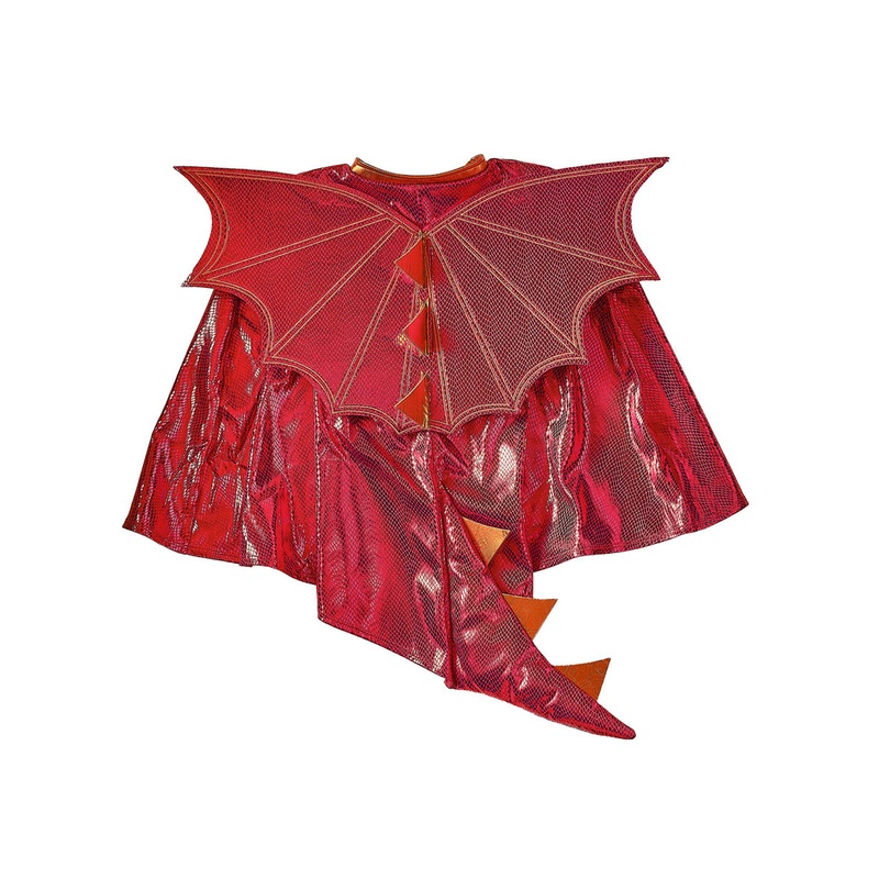 Boys Metallic Red Dragon Costume CapeIncludes:CapeDescription:Cape is red with metallic red scales all over.Attached to the back are matching red wings with orange spikes in the centre.There is also a fibre filled matching red tail with orange spikes attac