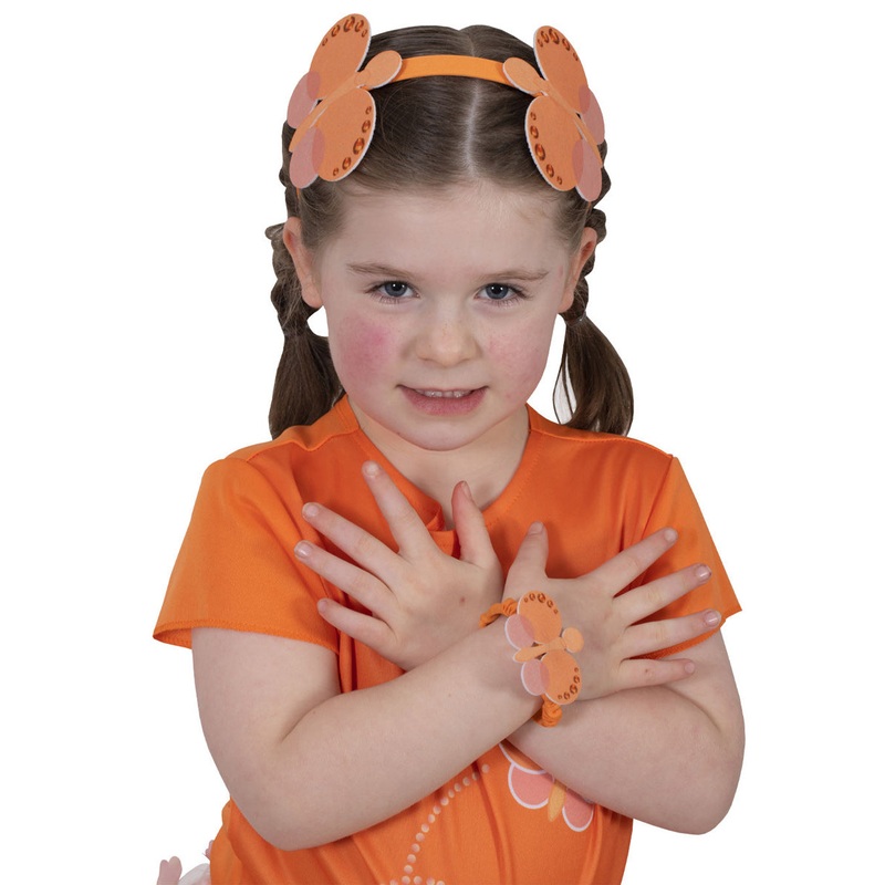 Girls Orange Emma Memma Bracelet and HeadbandIncludes:HeadbandBraceletPlease note: costume is not included.Description:Headband is wrapped in orange material.Attached to each side are orange felt butterflies.Bracelet is made from an elasticated orange cove