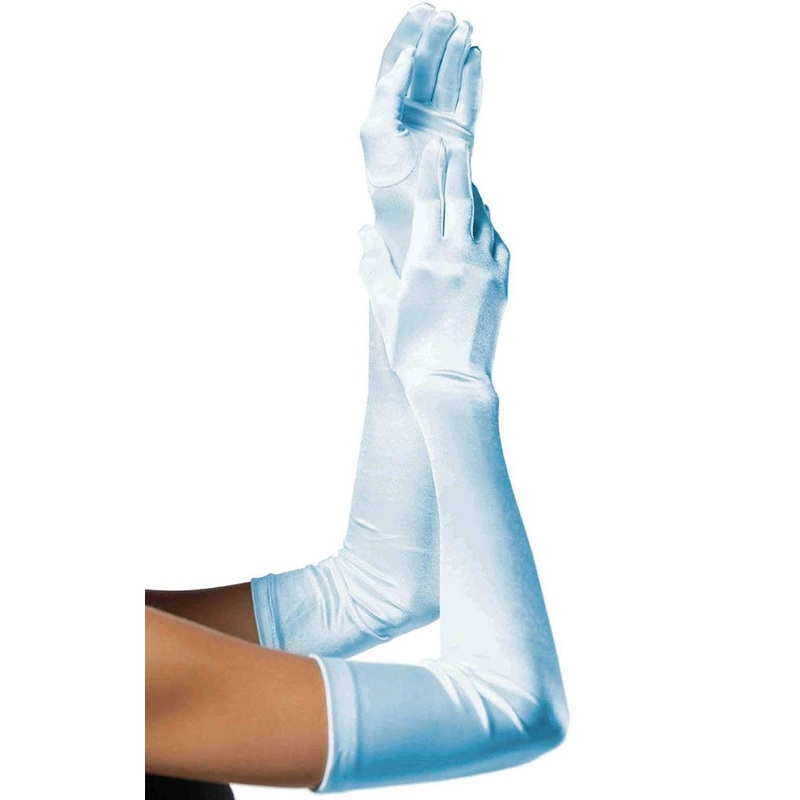 • Extra long blue deluxe satin fabric costume gloves.