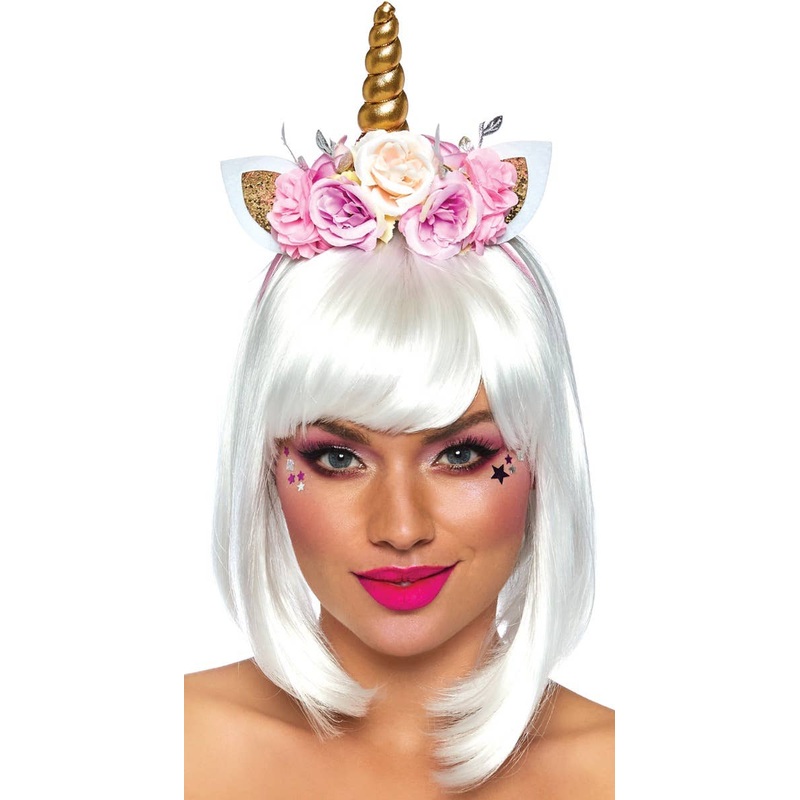Flower Unicorn Headband Costume AccessoryStep straight out of a fairytale when you wear this Womens gold unicorn headband! Wear this magical unicorn headband to your next fairy tale fancy dress party. This gold coloured unicorn horn and ears with the pink