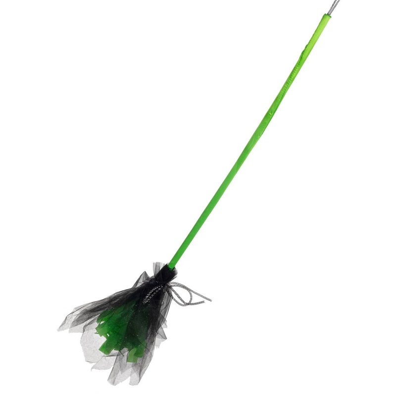 • Broomstick features a cylindrical handle that is covered with green satin.