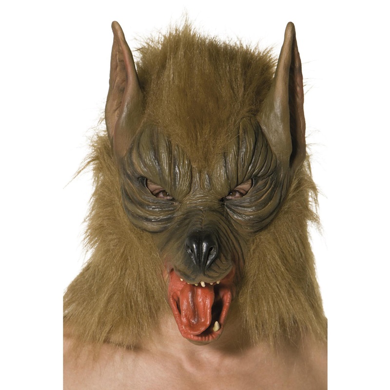 Adults Brown Faux Fur Latex Wolf Costume MaskIncludes:MaskDescription:Mask is made from brown latex and covers the whole head.Wolf mask has brown faux fur all over.Costume mask features wolf facial features including ears, nose and mouth.Mask has two eye h